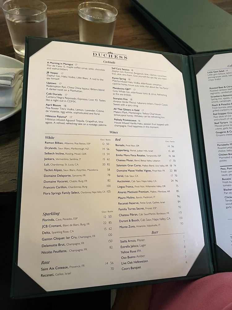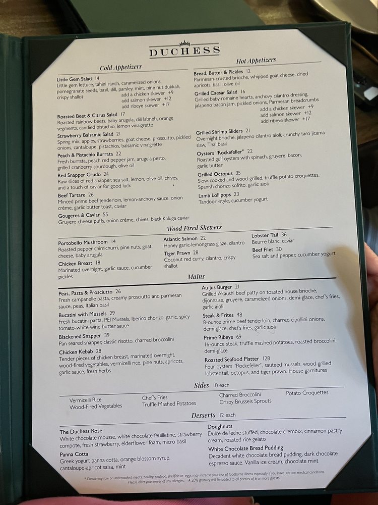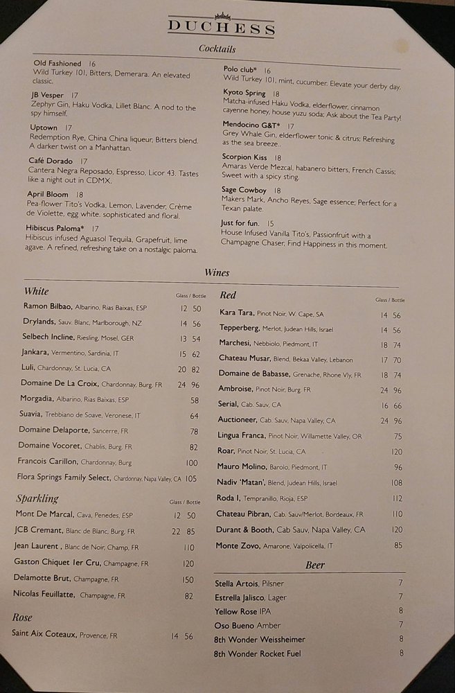Duchess, located in Houston, TX, is a trendy and intimate seafood restaurant known for its great offerings for groups. Their menu boasts a variety of cold and hot appetizers, including Beef Tartare, Grilled Octopus, and Oysters Rockefeller. The Peach & Pistachio Burrata and Roasted Beet & Citrus Salad are must-tries for those looking for refreshing starters. The Express Lunch option is a great value at $30, providing a quick and delicious midday meal. With options for delivery and takeout, Duchess makes enjoying their delicious seafood dishes convenient for all. The phone number to place orders is (713) 832-4370. If you're looking for a seafood dining experience that is both upscale and inviting, Duchess is the place to be.
